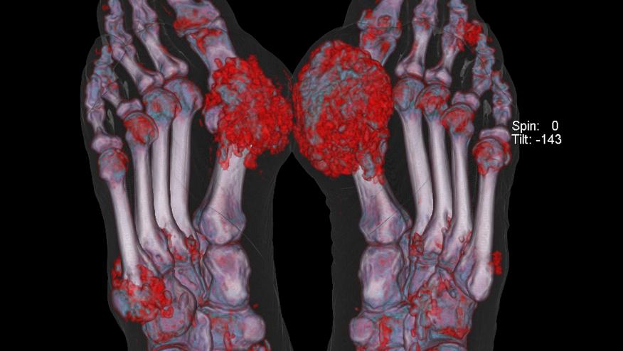 Dalbeth and coworkers studied 92 patients with gout and using DECT scanning have shown those with urate deposition on DECT were 8.5-fold more likely to have erosive disease on plain radiographs. Of the 920 joints assessed by DECT, 16.6% of them had dual-energy CT (DECT) urate deposition. These results suggest urate crystal deposition is integral in developing structural joint damage in gout.