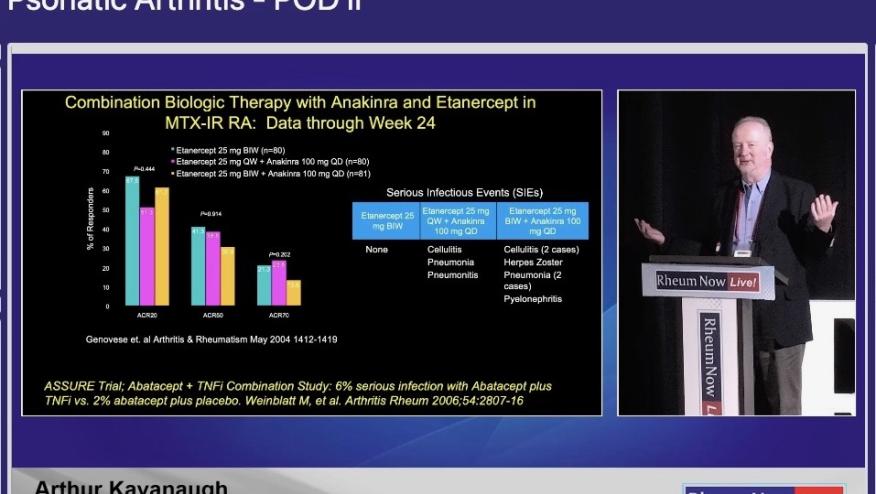 The benefits of combination therapy are well known in rheumatoid arthritis with the use of conventional and biologic DMARDs, yet data has been conflicting in psoriatic arthritis (PsA). Despite various and efficacious options for management of PsA there is still an unmet need for patients with inadequate responses to current therapies or difficult-to-treat disease. The role of dual biologic therapy targeting different inflammatory pathways has become an area of great interest in the field.